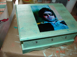 Caixa baú com foto, aplicação de pedraria e tinta relevo