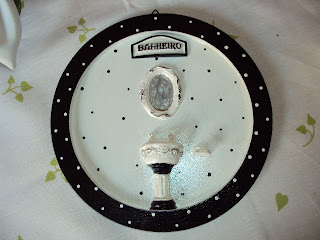 Preto e branco: Caixa de jóias, trava de porta gata, vasinho com tulipas e placa para porta do banheiro