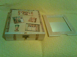 Caixa em MDF com pátina, aplicação de pedraria e decoupage.