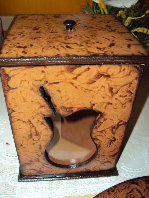 Com decoupage de cozinheiros gordinhos, tampa com pintura e detalhe do miolo em botão de madeira.