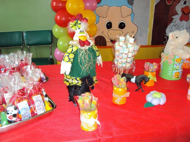 Foi tudo bem simples fiz as latas decoradas com flores comestíveis de bala de goma e as latas grandes com alça e motivos de fazenda. Os brinquedos eram dela, cavalos, porco, ponei, boneca tudo para alegrar a mesa. As galinhas grandes são vidros decorados que comprei da amiga Kelen que é artesã e as galinhas na frente do bolo também são criação dela, na verdade é um móbile que já está na minha futura cozinha, hehe.